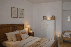 Cette chambre double lumineuse et spacieuse est décorée dans un style alliant l’ancien et le confort, son joli parquet lui donne un charme tout particulier.